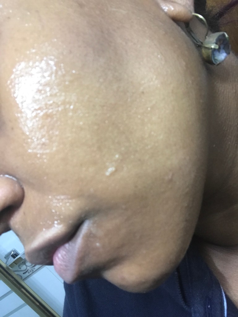 Me aplico el mismo con una brocha y la paso una o dos veces en la nariz y en las mejillas, arriba del área donde se pone el «blush» o rubor. Cuando el producto es en crema solo lo aplico en las mejillas.